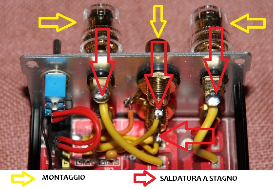 Le frecce rosse indicano i punti in cui si deve eseguire la saldatura a stagno, collegando le piattine dei connettori al filo di colore giallo, finire l'assemblaggio fissando il coperchio utilizzando gli appositi materiali ( coperchio viti e giraviti ).